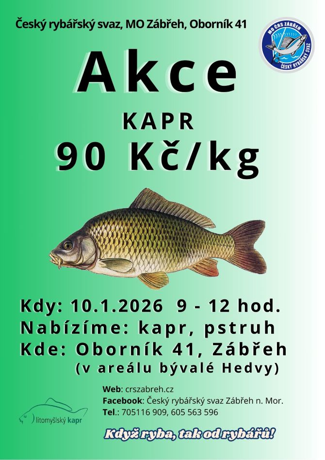 zítra nabízíme živého kapra za akční cenu 90 Kč/kg v čase 9-12 hod. Kromě toho je v nabídce také živý pstruh duhový za běžnou cenu.